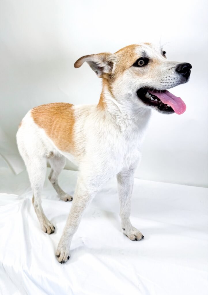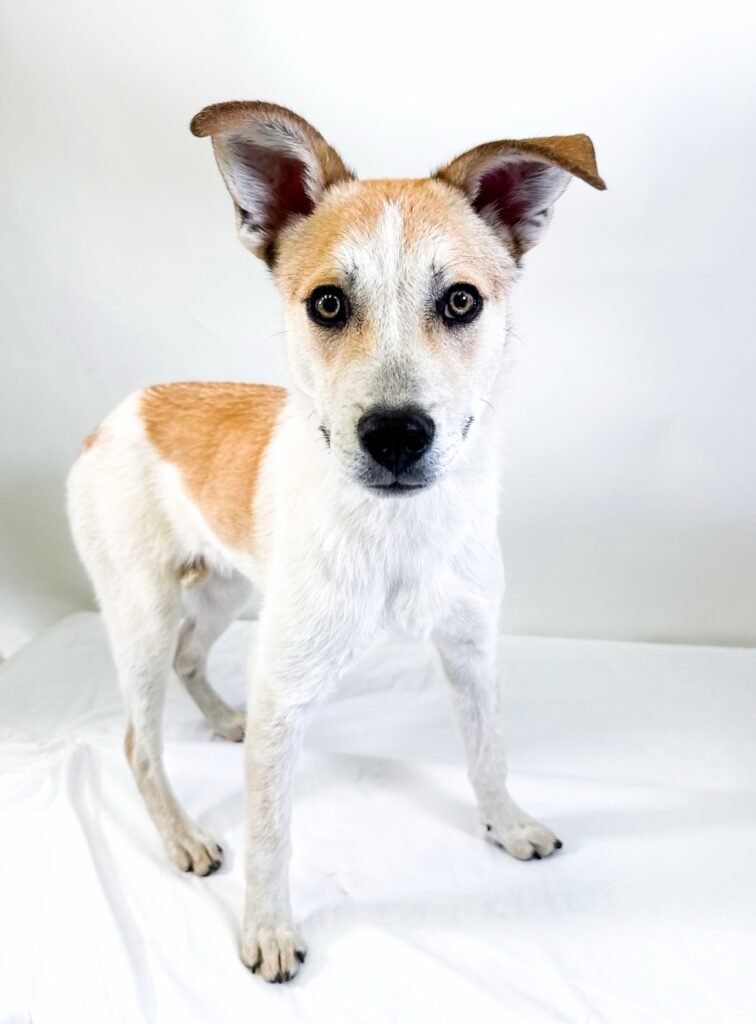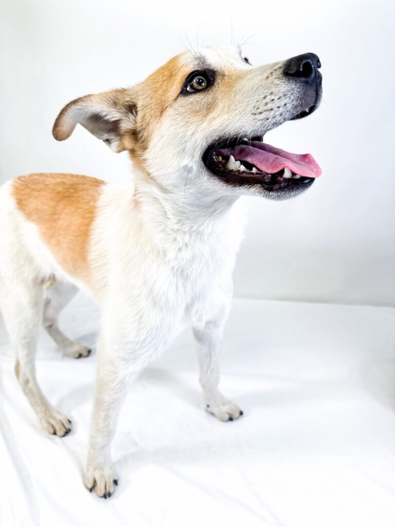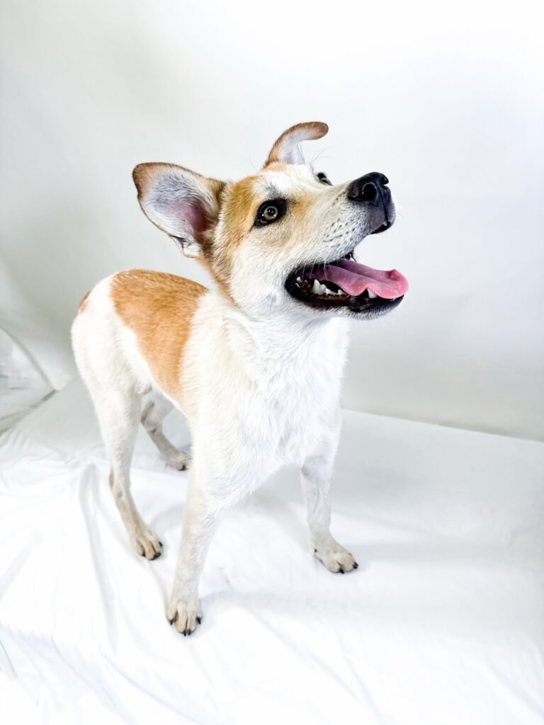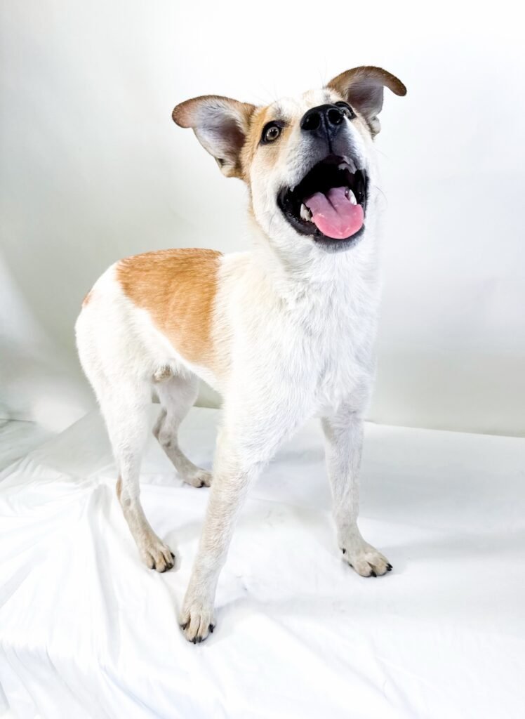 This gentle girl has soulful eyes and a sweet temperament. She’s playful – running and wrestling with her foster brothers – and also a cuddle bug who loves to stretch out on the couch. She’s curious about the world and wakes up with a loud yawn each morning, signaling that she’s ready to potty outside and get the day started! But she’s happy to follow along and is more likely to watch a new situation than rush right in and is working on basic commands and leash walking. Shes dog-friendly, people-friendly, and – because she hasn’t shown any prey drive – could likely live peacefully with cats. She’s around 28 pounds now and will likely grow to be around 30-35 pounds, which is the perfect in-between size.
