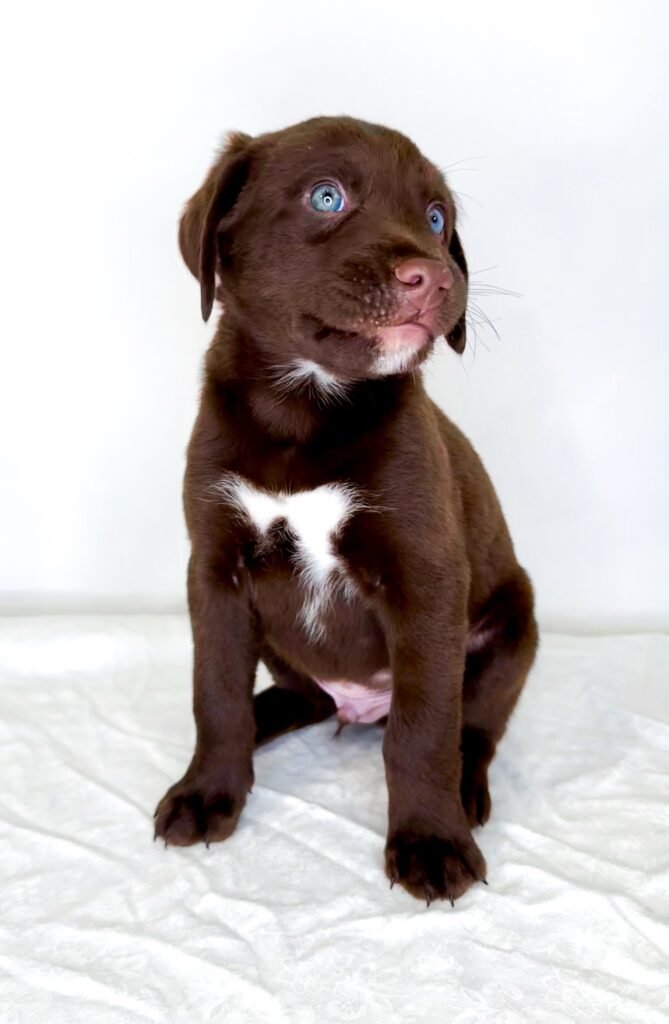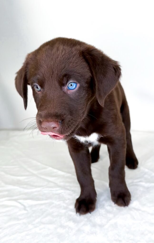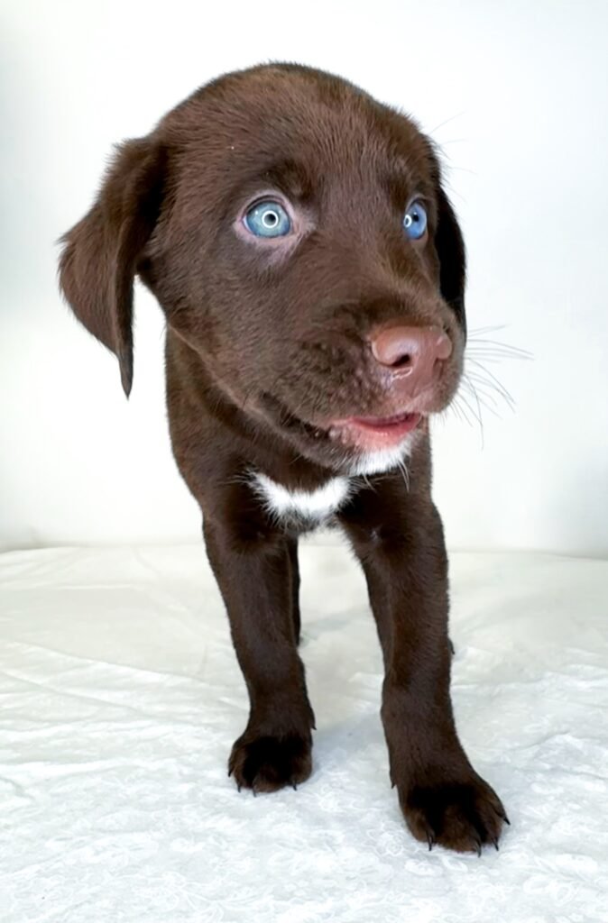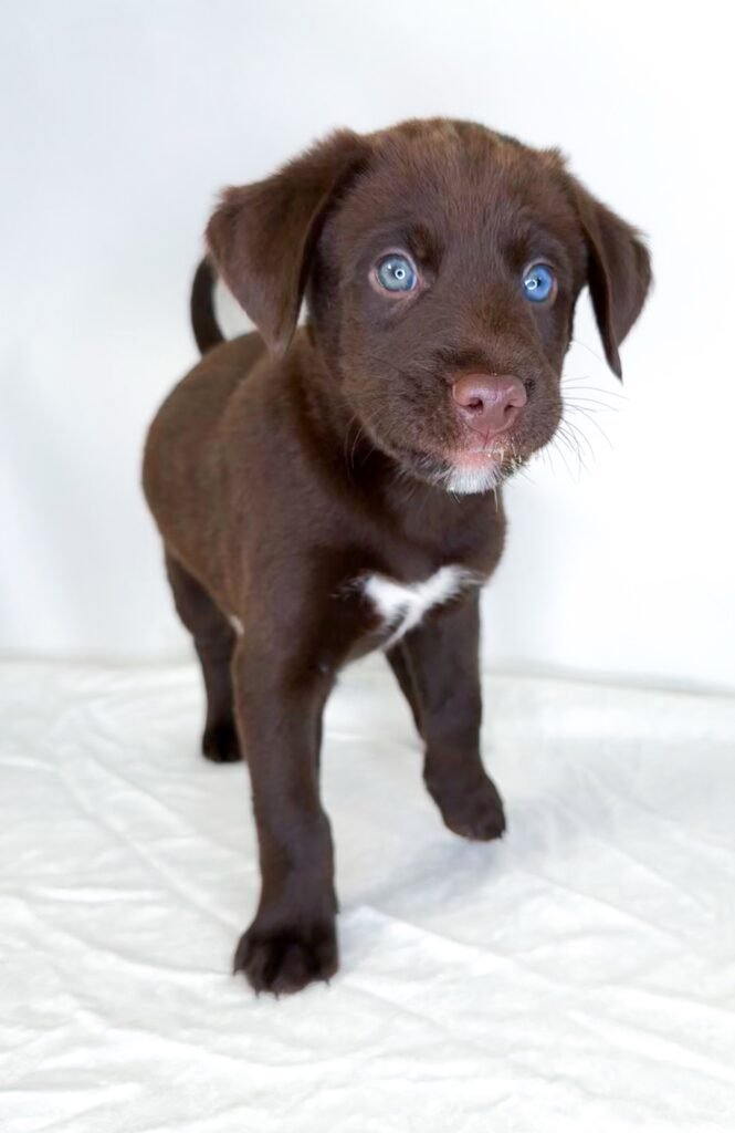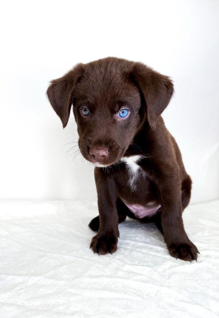 Lambda is the chunkiest and most handsome chocolate Lab mix boy, made even more unique with his two different colored eyes!