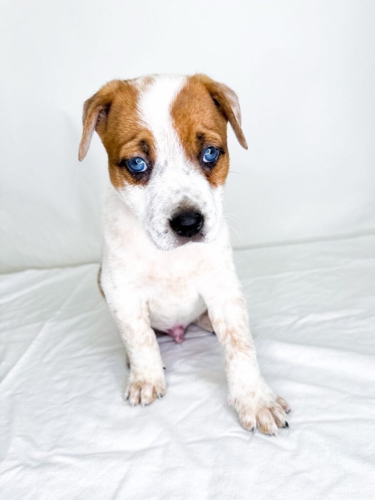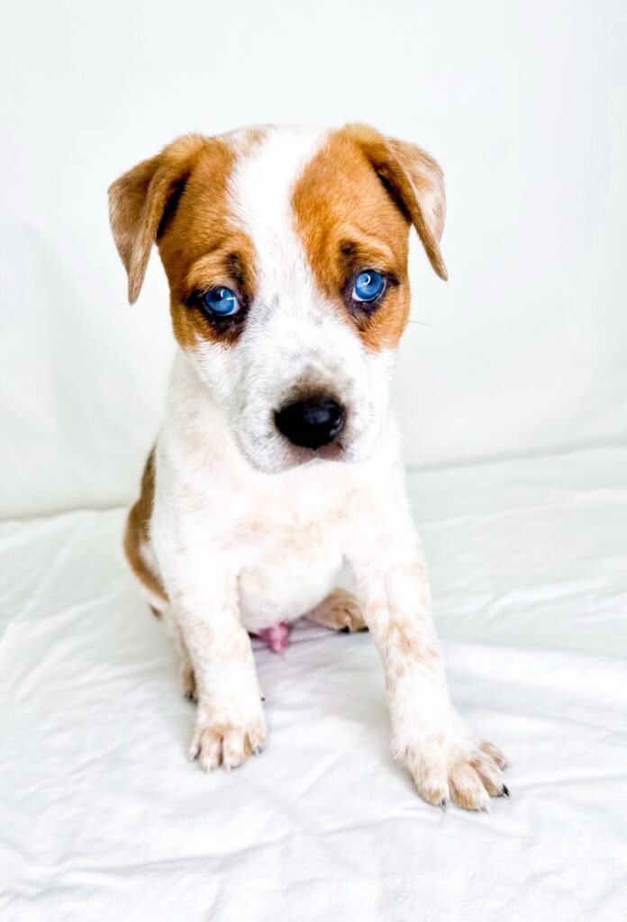 Slam is a great balance of play and affection. He’s a bit timid with loud noises but is the first pup to greet people and ask for attention.  He loves to play with toys and explore the yard and is very good at running to his foster mom when he’s called.  Slam is great with people and other dogs. When he’s not out playing he sleeps quietly in a puppy pen with his siblings for naps and overnight. He is very young so he hasn’t begun potty training yet.  He’s wishing for a fun forever family who has a lot of time for him and would love having a dog brother or sister.  This blue-eyed boy will capture your heart and give you lots of kisses.